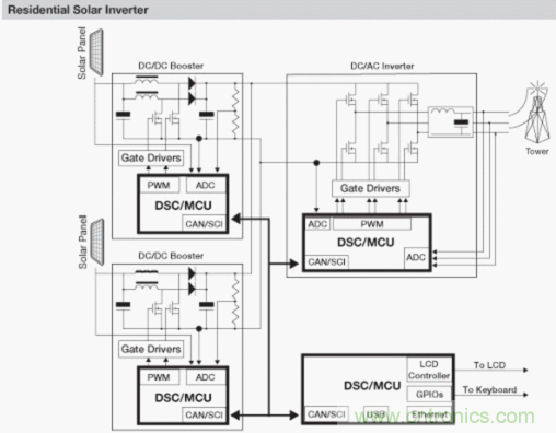 图2:基于飞思卡尔MCU和DSC的家庭太阳能转换系统