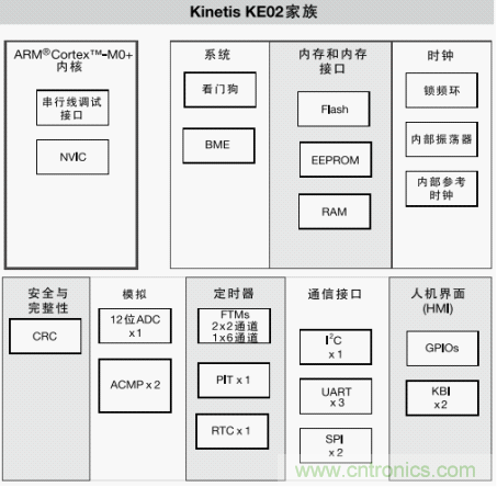 以Kinetis子系列KE02 MCU为例来看。KE02 MCU以ARM Cortex-M0+为内核,该内核以其低功耗特性深获市场赞誉。KE02也是Kinetis E系列的入门级产品,引脚与整个E系列兼容,扩展灵活,另外,它们还与8位S08P系列兼容。