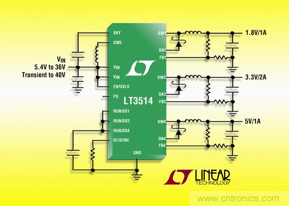 LT3514的开关频率可由用户编程在 250kHz 至 2.2MHz,且在整个频率范围内是可同步的,从而使设计师能优化效率,同时避开了关键的噪声敏感频段。其 28 引线 4mm x 5mm QFN 封装和高开关频率允许使用小型的外部电感器和电容器,可为多输出应用提供占板面积紧凑和热效率很高的解决方案。