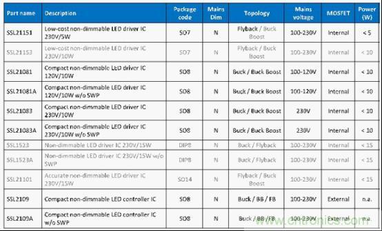 图1 NXP中小功率市电供电非调光LED驱动IC选型表格