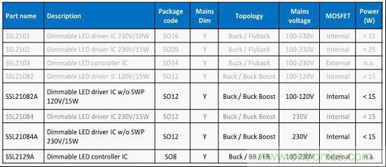图2 NXP中小功率市电供电可控硅调光LED驱动IC选型表格
