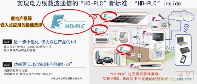 “HD-PLC”inside是最适合利用已有电力线的、作为高速电力线载波通信方式之一而备受瞩目的“HD-PLC”的嵌入的标准,该标准通过嵌入白色家电、HEMS、BEMS以及HAN相关设备等,可将电力线作为通信网络使用。新标准产品搭载了间歇动作功能,与以往的PLC产品相比,可进一步大幅降低功耗。