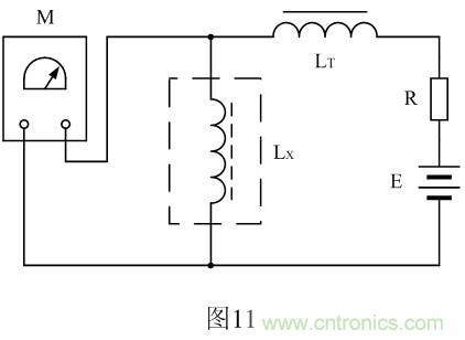 这里顺便说明,采用图7测试时应该注意的地方。图7中,隔离电感LT的数值要求是测试电感Lx数值的3倍以上,并且测量高压包初级线圈的初始电感值L0时,最好也要接入电路之中。这里,隔离电感LT可选取20毫亨以上的矽钢片直流电感,电感的铁芯要留有气隙;流电源可用一个稳压电源与一个大功率电阻串联代替,如图11,或用一个稳压电源与一个大功率晶体放大器串联来代替,如图12。