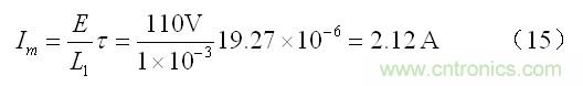 根据前面分析,以及图8和图11,正常工作时,流过高压包初级线圈的最大电流Im不应该超过极限电流值Imax的70%,由此,可以求得流过高压包初级线圈的极限电流Imax为3.21 A 。
