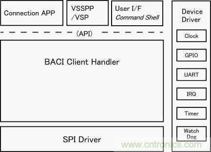 BACI通过简化与主机之间的通信来降低访问频率。而且,在结构设计上采用通过事件使主机启动的结构,因此,是尽可能使主机停动来抑制耗电量的设计。综上所述,本LSI在整个结构??樯辖辛私档秃牡缌康纳杓疲佣?,使纽扣电池驱动3年以上连续工作成为可能。主机和堆栈结构如图2所示。