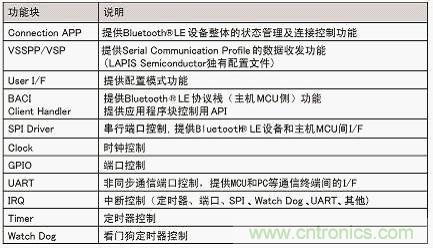 本??樵贐luetooth® LE LSI (ML7105-00x)之外还内置有Pattern ANT、RF匹配电路、EEPROM、OSC。LAPIS Semiconductor出货时将通过Pattern ANT及RF匹配电路调整RF性能,因此,用户无需调整即可安装于商品中。EEPROM可存储主要含有RF调整值、通信模式、设备地址的配置参数,并可存储用户自己的参数。OSC由主时钟的26MHz晶体振荡器和调整电路构成,已调整为Bluetooth® LE所要求的频率精度。
