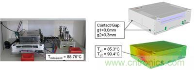 底盘的一部分被用作汽车功放的冷却散热片。底盘的一个重要方面在于顶部支架和底盖的热接触程度(关乎制造公差)。对模型假设进行验证是提高模型精确度的关键。这样可以测量产品原型并利用测量结果来比较模拟模型。方案1 (g1) 无间隙(完全热接触),而方案2(g2) 则存在0.3毫米的间隙,因此盖子之间没有热接触。通过比较所测量的外壳温度,方案2(有间隙)似乎最能代表支架的接触程度。