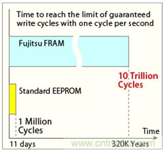 FRAM是一种兼具非挥发性与随机存取功能的存储器,能在没有电源的情况下可储存及高速写入数据。值得注意的是,在众多非挥发性内存技术中,FRAM能保证一万亿次以上的写入/擦除周期。富士通半导体自1999年开始量产FRAM产品以来,已将上述产品特性广泛应用在工厂自动化设备、测试仪器、金融终端机及医疗装置等领域。