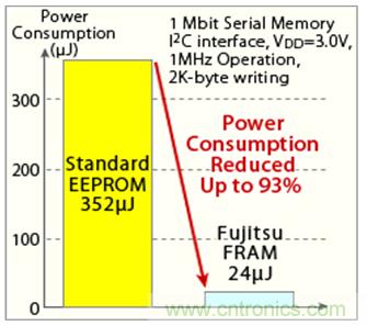 图3:EEPROM和富士通半导体FRAM产品之数据写入作业功耗比较
