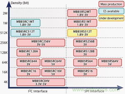 MB85RC1MT的出现增加了富士通半导体的FRAM产品阵容:I2C 接口(支持4 Kb至1 Mb内存容量)和SPI接口(16 Kb至2 Mb内存容量)(如图4)。这些FRAM产品采用业界标准的8针脚SOP封装,因而可取代EEPROM或序列闪存,并适用于工厂自动化、测试仪器及工业设备等应用,更无须大幅修改电路版的设计。