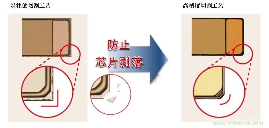 ROHM通过采用与以往不同的、独创的微细化技术,在开发制造系统的同时,改进切割方法,在切割工艺上将封装尺寸公差大幅降至±10μm。通过提高尺寸精度,消除毛刺和碎片,有助于减少贴装时的吸着误差以及提高贴装精度。