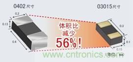 03015电阻器在量产的电子零部件中达到了最小型。相比以往的0402产品,成功地将尺寸降低了56%。