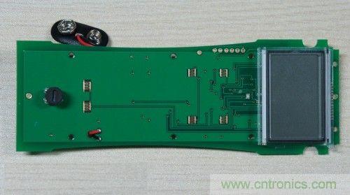 翻转板卡,另一面的电路就更少了,除了一个段式的LCD模块,以及几个功能按键(黑色旋钮为校准温度的变阻器),就没什么东西了,有意思的是段式LCD??橛隤CB板的连接方式。