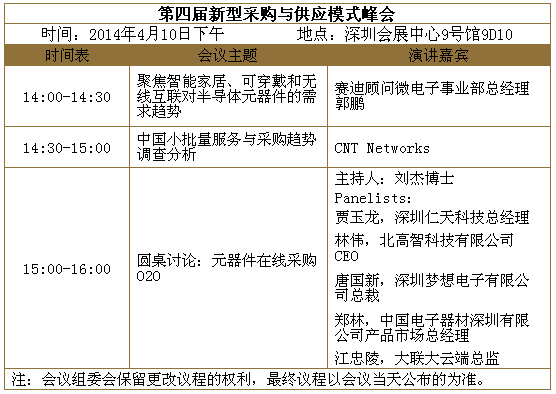 此次峰会旨在帮助供需双方的经理人了解热点市场带来的对半导体元器件的需求变化,中国小批量供应服务与采购趋势。圆桌讨论将针对采购和供应中的热点话题,中国电子分销商联盟秘书长刘杰博士与行业领先的国内和国际分销商总裁和总监们逐一分享思路,欢迎参与互动。参会可以通过网上或微信(关注我爱方案网),报名注册:m.5r3h.cn/seminar/95/agenda