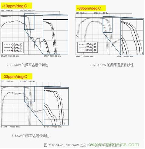 TC-SAW、STD-SAW以及BAW的频率温度依赖性的比较