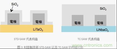 图3是村田制作所STD-SAW以及TC-SAW构造的示意图。SAW双工器的频率温度依赖性是由于使用了压电电路板造成的。此外,STD-SAW、TC-SAW都是因为使用的压电电路板具有频率温度依赖性的相同特点。如图3所示,TC-SAW最具代表性的特征之一是整块电路板跟STD-SAW相比它的表面覆盖了一层很厚的二氧化硅(SiO2)。压电电路板的温度上升的话频率就会降低,那么频率温度系数就会变成负值。另外,SiO2具备正频率温度系数的特点。因此,和STD-SAW相比的话由于覆盖了一层厚SiO2的独特构造,SiO2的正频率温度系数的影响会变大,那么SAW双工器与STD-SAW相比就实现了抑制频率温度依赖性的特点。STD-SAW的?;つiO2具有强大的特质,如果覆盖了像TC-SAW一样厚的SiO2的话就不能保证带宽,同时也不能获得优良的特性。因此,TC-SAW将电路板的材料从LiTaO3变成了LiNbaO3,才能够确保必要的带宽。此外,TC-SAW的LiNbaO3的切割角发生了变化使得频率选择性变得可控制,村田制作所运用了对应项目的必要特性设计了符合市场需求的最佳切割角。