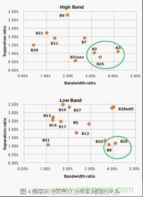 双工器的设计根据Third Generation Partnership Project (3GPP)的规格根据频带的送信和收信带宽以及送信端和收信端的频率间隔(Separation ratio)决定了其难易度。一般来说频率的带宽越广那么送信端和收信端的频率间隔越小难易度就越高。总结两者的关系来看,如图4。村田制作所正致力于图4中圈出的部分,计划优先实现TC-SAW对应的产品。