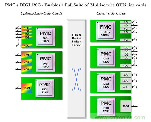 PMC的DIGI 120G是一款功能强大的100G OTN处理器,设计初衷是实现下一代光传送网络。DIGI 120G提供了高度灵活的平台,使得OEM可以设计范围广泛的OTN解决方案,其中包括用于OTN交换的高密度线卡以及功能强大的用于P-OTN的混合OTN/分组线卡。DIGI 120G的独特性在于: