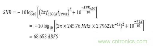 现在,通过计算得到了所有必须的要素,但依然缺少最后一个公式。 需要计算此抖动对AD9643的SNR产生的影响。 现在来看看这个公式是什么,然后代入已知数。已知时钟频率和rms抖动。 从AD9643数据手册中可以得到140 MHz模拟输入频率下的SNR等于71.4 dBFS。 使用公式,可以看到结果为: