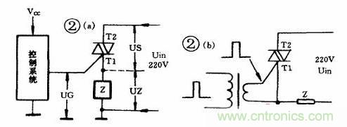 改进此电路的方法之一是,采用触发变压器隔离控制系统的参考点(如图2b), 触发信号可以由BT33组成锯齿波发生器受控于控制系统(矩形波也可以),这样,不受初级参考点的影响,触发变压器次级可直接接在G与T1之间,与负载上电压无关。