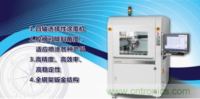 圣铭精密机械有限公司一直致力于自主产品的研发,目前已经自主研发了全自动选择性涂覆机,全自动 LED 芯片分光分拣机,全自动 LED 插件机,全自动 PCB分板机等产品。在本次NEPCON展会中,深圳市圣铭精密机械有限公司将展示国内首创的全自动一体涂覆机,可实现一台机器正反面喷涂,具备生产效率大幅提高,节省空间等特点,同时,全自动涂覆机与高速点胶机的展出代表着深圳市圣铭精密机械有限公司的研发实力与明显提高的产品生产力,值得一看。