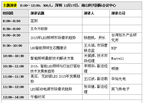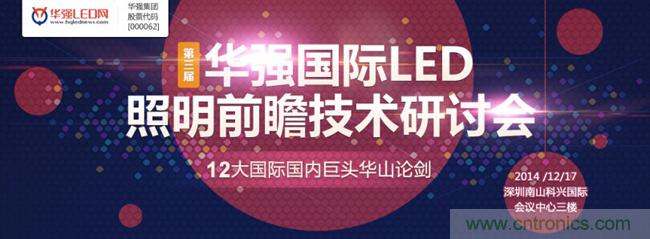 《第三届华强国际LED照明前瞻技术研讨会》将于2014年12月17日(周三)在广东省深圳市科技园科兴国际会议中心3楼举行,届时台湾拓扑产业研究所所长杨胜帆、NXP市场营销总监王永斌、Marvell技术市场经理关振源、明微电子副总经理李照华、昂宝副总裁高维、昂帕董事长桑钧晟博士、英飞特电子副总经理张华建、华灿光电副总裁王江波、聚元微电子总经理韩兴成、绿宝石技术总监伍松、中昊光电总经理王孟源、华灿光电副总裁王江波、清华大学副研究员钱可元将亲自前来与您共同探讨2015年LED照明市场的新需求、新变化和新趋势,精彩就在眼前,期待您也能拨冗前来共襄这一LED照明行业全明星盛会。