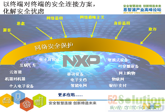 从以上图中可以看到NXP保障网络安全的方案,从工业控制,智能电网,医疗设备和云服务方面。另外,NXP也提供以终端对终端的安全连接方案在互联汽车、物联网和便携的可穿戴式应用。