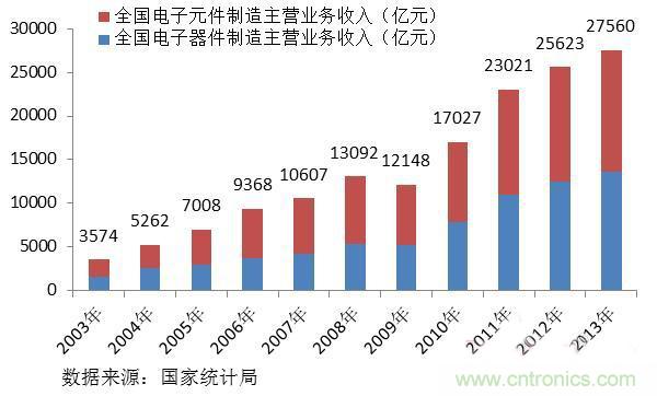 电子元器件是我国电子信息产业中的重要门类,产值比重约占电子信息产业的五分之一。2003-2013年,我国电子元器件行业增速迅猛,年复合增长达到了22.7%,从2003年的3574亿元增长到2013年的2.76万亿元。其中,2013年电子器件制造和电子元件制造主营业务收入分别达到1.39万亿和1.36万亿元。