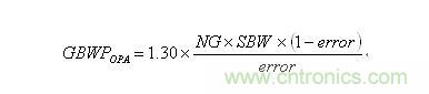 就该电路而言,如果您想要容许放大器 0.05 的增益误差,同时您知道因产品和温度的不同,放大器的 GBWP 会改变 30% 最大值,则您需要一个具有 247 MHz GBWP 的放大器。产品选择部分的指导公式如下: