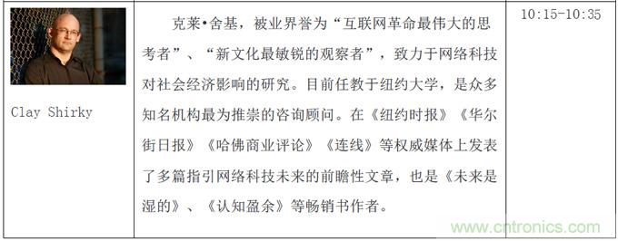 本次创客论坛三天共三个主题:启蒙创新、创客本质和协同合作,将邀请到包括畅销书《失控》作者Kevin Kelly、克莱舍基、Arduino开源电子原型开发平台联合创始人Massimo Banzi、第一个生物创客空间BioCurious联合创始人Tito Jankonski、F.laobo的制作人和ArduinoFio的设计者Shigeru Kobayashi、Intel最小的实习生Joey Hudy和为麻省理工研究生授课的14岁电子神童QuinEtnyre等等共50余位来自全世界各地的创新领域领军人物。