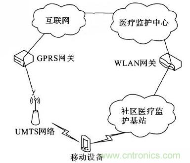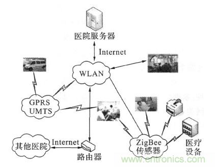 系统中包括无线个人网络(wireless person2al area network,WPAN ) 、ZigBee网络以及一系列医疗监护网络的医疗传感器节点。本系统具有良好的扩展性,例如医护人员在急救途中或在其他医院可以分别利用WLAN /UMTS网关和互联网与系统进行信息交互。
