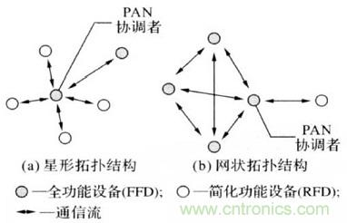 星形网络结构的通信是以FFD作为PAN协调者完成与设备之间的通信,在该网络中PAN协调者的功能是初始化网络、中止和路由信息。星形网络广泛应用于自动化家居、个人医疗监护系统和医院病房等小区域。