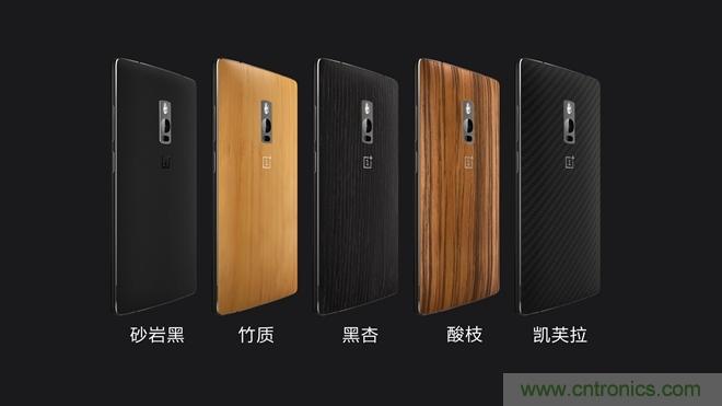 外观上一加2以1代产品为基础,在手感、质感上两个词上下功夫。新机采用金属材质边框,并调整边框背面弧度使之更贴合;材质方面,新品拥有砂岩黑、竹质、黑杏、酸枝、凯芙拉共计五种后壳版本。尽显复古,原始,典雅风格。侧面金属的加入和可更换后壳,让手感做出提升和差异化。