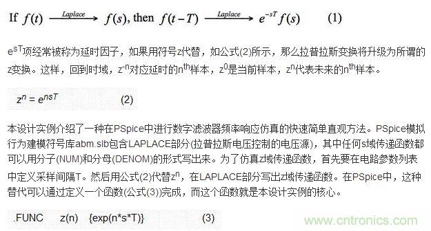 PSpice 已经成为模拟电路仿真使用的行业标准工具。模拟电路具有真实的物理实现,可以用它们的原理示意图进行仿真,其频率响应是电路时间常数的结果。与之相反的是,数字滤波器对一系列样本进行数学运算。数字滤波器的时间常数隐藏在采样间隔T中。因此数字滤波器一般是通过它们的传递函数进行数学仿真,而且为了做到这一点,能够方便地仿真由采样率fs引起的采样延时T=1/fs非常重要,因为这个延时定义和衡量了整个滤波器的响应性能。