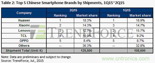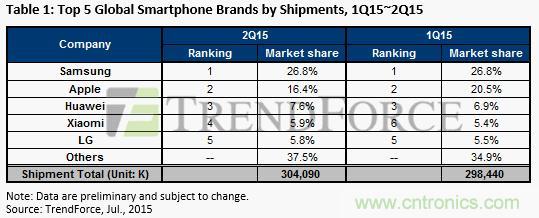 【导读】近日,市场研究机构TrendForce发布2015年度第二季度全球智能手机报告。中国的华为明显独领风骚。数据显示,三星虽然从苹果手里夺回第一的宝座,但是,Q1和Q2 几乎毫无变化。苹果的市场份额则一调再掉,从Q1的20.5%掉到Q2的15.4%?;氖谐》荻钤黾恿?%,小米的份额增加了5%。