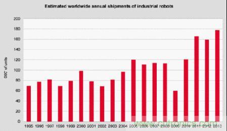 根据国际机器人联盟(IFR)2014年统计显示,2013年机器人出货量增长12%,成长至178,132台,如图1所示,工业机器人持续在汽车、化工、橡胶、塑料等行业以及食品行业增加;2008年至2013年,中国的工业机器人每年总供应量平均增加36%,并且可促使该国成为世界最大的机器人市场。