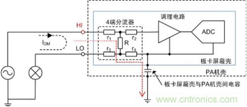 3.电流通道接入高端和低端,测量结果也不同,内部板卡屏蔽壳与机壳间多少都会存在一些杂散电容(空间中两个绝缘导体中存在电容),若电流通道接入高端,产生泄漏电流(图3中红色标记线),因此电流测量输入应当串在共模电压较低的地方(低端)。