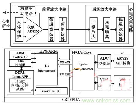 【导读】本设计实现了一种基于片上系统现场可编程门阵列(SoC FPGA) 的心电信号(ECG)检测系统。系统通过具有高输入阻抗、高共模抑制比和低噪声的前置采集放大电路,实现心电信号的拾取和预处理。