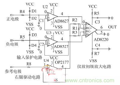 前置放大电路由前级放大电路、带通滤波电路和50 Hz工频陷波电路组成,其中,前级放大电路又包括输入?;さ缏?、右腿驱动电路和仪表运放放大电路组成,如图2 所示。