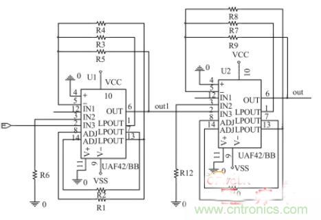 采集电路拾取的心电信号中有低频的基线漂移和高频干扰,还有在心电信号频率范围内的50 Hz 工频干扰,这些噪声对心电信号提取的影响非常大。设计了基于通用有源滤波??閁AF42 的带通滤波器和50 Hz 工频陷波器。带通滤波器电路的通频带为0.05~ 100 Hz,滤除了基线漂移等低频干扰和高频噪声,工频陷波器能有效滤除工频噪声。通过UAF42 可以方便地设计出各种类型和频率特性的滤波器,只需要计算出合适阻值的外接电阻器,经过简单的连接就能很好地满足设计要求,免去了在有源滤波器的设计当中对电容器、电阻器的选型和匹配的工作。工频陷波器电路图如图3 所示。
