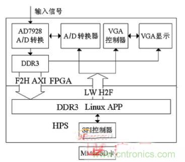 数字系统包括A/D 转换???、VGA 显示???、数据存储??楹退惴ù砟?椤oC FPGA 中的HPS 和其它的硬件??榭梢酝ü齉sys 进行配置,用Quartus II 进行硬件设计,Qsys 和Quartus II 编译可以产生软件设计所需的信息文件。移植嵌入式Linux 系统,下载sof 文件,用DS—5 进行基于Linux 的系统软件工程开发。
