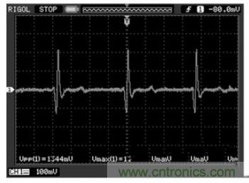受测者佩戴心电电极,用医用导联线接入到模拟前端采集电路,后端接入示波器,待信号稳定后就可以在示波器上观测到心电信号波形,图5 即为模拟前端电路实际测试波形图。