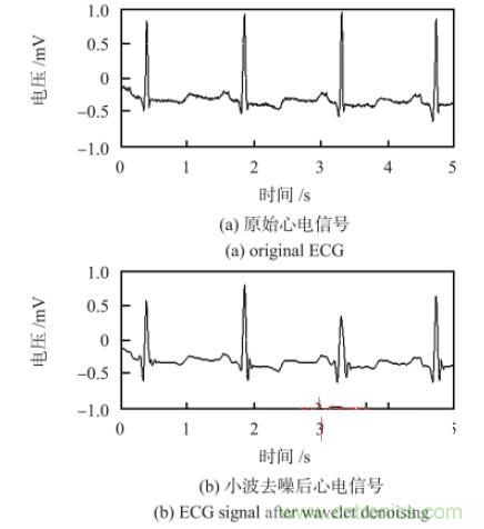 采用小波分析的方法进行心电信号去噪。小波分析由于能同时在时域和频域中对信号进行分析,具有多分辨分析的功能,所以,在不同的分解层上有效地区分信号的突变部分和噪声。对含有噪声的原始心电信号进行小波分解后,噪声部分主要集中在高频小波系数中,包含有用信号的小波系数幅值较大,但数目少;而噪声对应的小波系数幅值小,数目较多?;谏鲜鎏氐悖∪∥奁迫还兰沏兄刀孕〔ㄏ凳写?,然后对信号重构即可达到消噪的目的。图7 为心电信号小波去噪前后对比,信噪比可以达到121 dB。