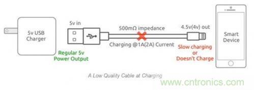 还拿上面那个例子来解释,在2A充电电流下,会产生1V的电压降,设备端充电电压仅为4V。除了可能会带来安全性问题之外,对智能设备而言,这么低的电压甚至无法对设备充电。