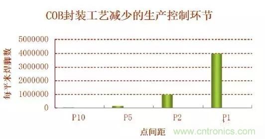 如果生产1平米的P10,COB封装工艺就要省去4万个控制点。如果将点密度缩小一倍,也就是点密度达到P5级别,COB封装工艺每平米就要省去16万个焊点。如果将点密度进一步缩小到P2.0级别,COB封装工艺每平米就要省去100万个焊点。如果点密度达到P1.0级别,COB封装工艺将会省掉400万个焊点。相反SMD封装如何保证这几百万个焊点不出现假焊、连焊、虚焊,是一项令人十分头疼的问题。