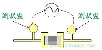 但是如果让这些探针直接接触到板子上面的电子零件或是其焊脚,很有可能会压毁一些电子零件,反而适得其反,所以聪明的工程师就发明了「测试点」,在零件的两端额外引出一对圆形的小点,上面没有防焊(mask),可以让测试用的探针接触到这些小点,而不用直接接触到那些被量测的电子零件。