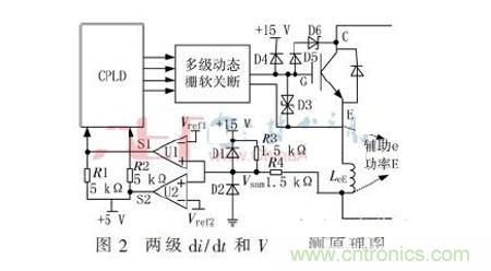 当IGBT发生二类短路后,电流上升率主要受母线电压和负载影响,上升速率低于一类短路的电流上升率。此时,VeE的绝对值较小,即得到的采样电压Vsam小,不适合采用同一级DI/DT进行检测。而第一级DI/DT检测就可以最佳地解决二类短路的检测。当IGBT发生二类短路后,集电极电流先快速上升,然后VCE也开始上升直至母线电压。通过设置合适的第一级DI/DT检测阈值就可以准确地检测到IGBT模块发生的二类短路,驱动器采取适当的软关断措施关断IGBT模块,最佳地?;GBT???。