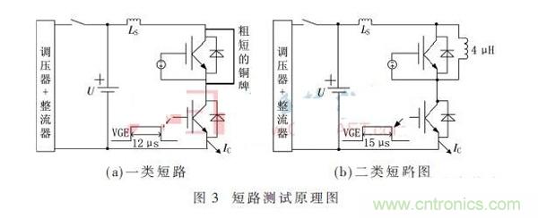 图3(a)为一类短路测试原理图,电网电压经过调压器和整流桥,将母线电容电压充到1 500 V,上管igbt的门极被-15 V关断,且用粗短的铜排将其短路。对下管的IGBT释放一个12 μs的单脉冲,直通就形成一类短路。图3(b)为二类短路测试原理图,将母线电容电压同样充到1 500 V,上管IGBT的门极被-15 V关断,且给上管并联一个4 μH的电感作为负载,下桥臂通过IGBT驱动器释放一个15 μs的单脉冲就形成二类短路。