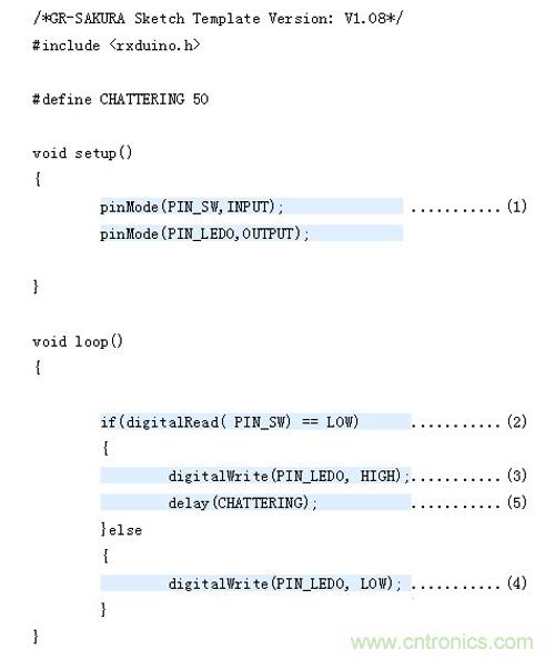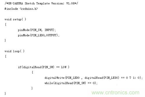 由于这次使用的是GR-SAKURA电路板上的开关和LED,所以即使不知道与其相连的引脚号和端口号,如为开关,只需在程序中写入“PIN_SW”,如为LED,只需在程序中写入“PIN_LED0”?“PIN_LED3”,?;ǔ绦蚩猓⊿AKURA Library)就会进行处理。