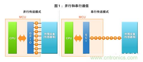 单片机是嵌入式设备的“头脑”,其与作为嵌入式设备的“手和脚”是各种外围设备(输入输出设备等)连接。单片机应该怎样与这些外围设备连接才好呢?比如,我们来考虑一下将传感器与单片机连接的情况。如果使用本连载第1期中介绍的“GPIO”的话,从传感器向单片机传送8位信号时需要使用8个引脚。这种传送模式被称为并行(并行通信)模式(图1―左)。但是,仅一个传感器就需要连接8个引脚,确实太可惜了,是否还有连接更少的引脚就能达到同样目的的方法呢?
